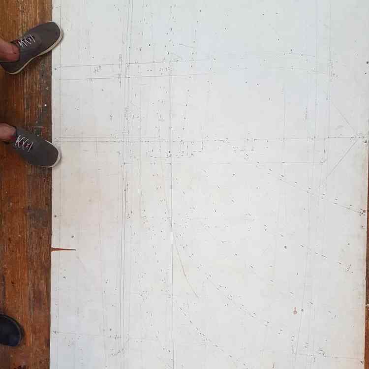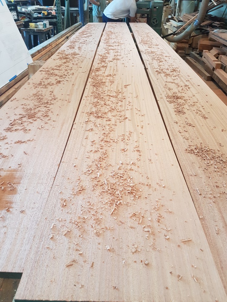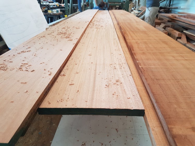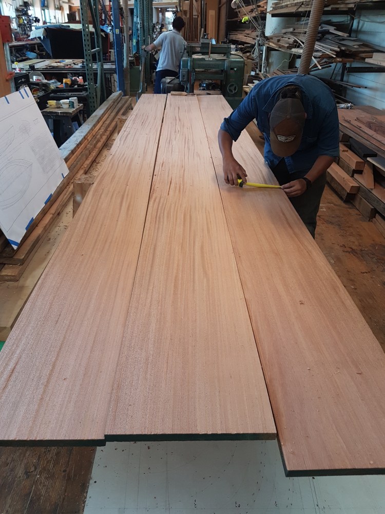 Take some really big pieces of wood and turn them into slightly smaller, smoother pieces of wood. In this case, it’s mahogany and is going to be the sides of the Corinthian’s centerboard case. The last photo is the lofted lines on the floor; basically, a full-size 3-view drawing of what the boat will look like.
