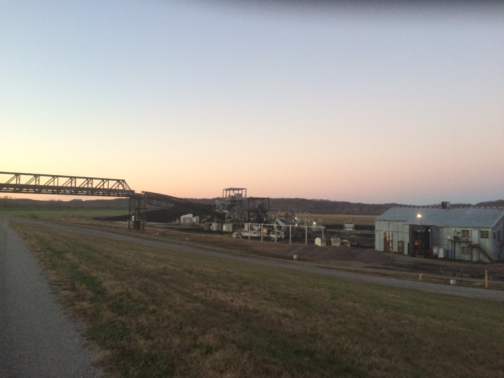 Heading north to Carbondale, I encountered the greatest challenge of the Illinois leg of the trip: The Indian restaurant I had hoped to have lunch at was unexpectedly closed. I should point out now that one of the several purposes of this trip is to complete a nationwide evaluation of Indian restaurants. So far, the best was Lumbini in Baltimore, with Princeton NJ coming in a close second, and Taste of India in Charlottesville a distant third. I had high hopes for Reema’s Indian Cuisine, but now I may never know. After coping with the disappointment and having some peanut butter sandwiches for lunch, I headed west towards to Mississippi, where I was rewarded with the most incredibly flat floodplain to ride upon. My goal for today had been to make it to Missouri, but with such an abundance of flat land to traverse I took a scenic detour, riding along the levee on the riverbank and crisscrossing the fields, in total awe of the zero elevation change for almost 12 miles. Curiously, it appears that there is a coal mine only a few hundred meters from the river itself, with a huge conveyor belt that travels up, over the levee and road, and all the way to the river to deposit coal in barges. It’s very loud- I think they keep the machinery running all the time regardless of mining/loading activity- and probably is annoying to live near. But it might explain the villages build seemingly at random in the middle of what’s otherwise a wheat field- I guess someone is doing the mining and loading.