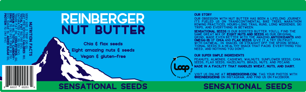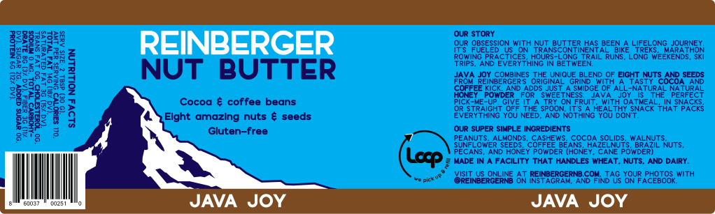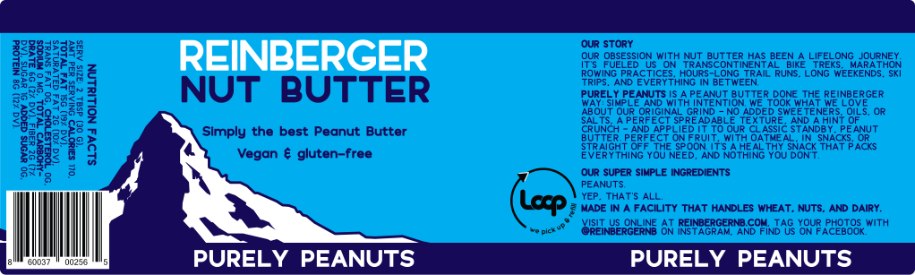 Small design variations indicate big changes; The addition of the Loop logo signifies Reinberger Nut Butter’s partnership with TerraCycle‘s Loop venture, launched in New York City in May 2019. Providing consumers with a quality good in a durable, fully reusable package, working with Loop enables us to reach out to millions of customers who otherwise would be unavailable. The benefits aren’t one way – Reinberger products make up three of Loop’s top-selling items, demonstrating that consumers love both the simple joys of Reinberger and the ecologically sound promise of Loop‘s distribution model.