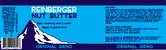 Reinberger’s current product lineup remains with the same seven nut butters, but now includes the addition of 4-ounce jars in addition to the traditional 16-ounce offerings. Challenged by much smaller printable areas and the limitations of the printing process, adding information to the jar lid is an obvious solution. Both cases preserve the focus on the brand’s commitment to quality and nutrition, highlighting their use of mixed nuts and seeds and avoidance of any additional ingredients that could dilute or contaminate their product. Additionally, the standardized nutritional information reflects the brand’s growth to further horizons.